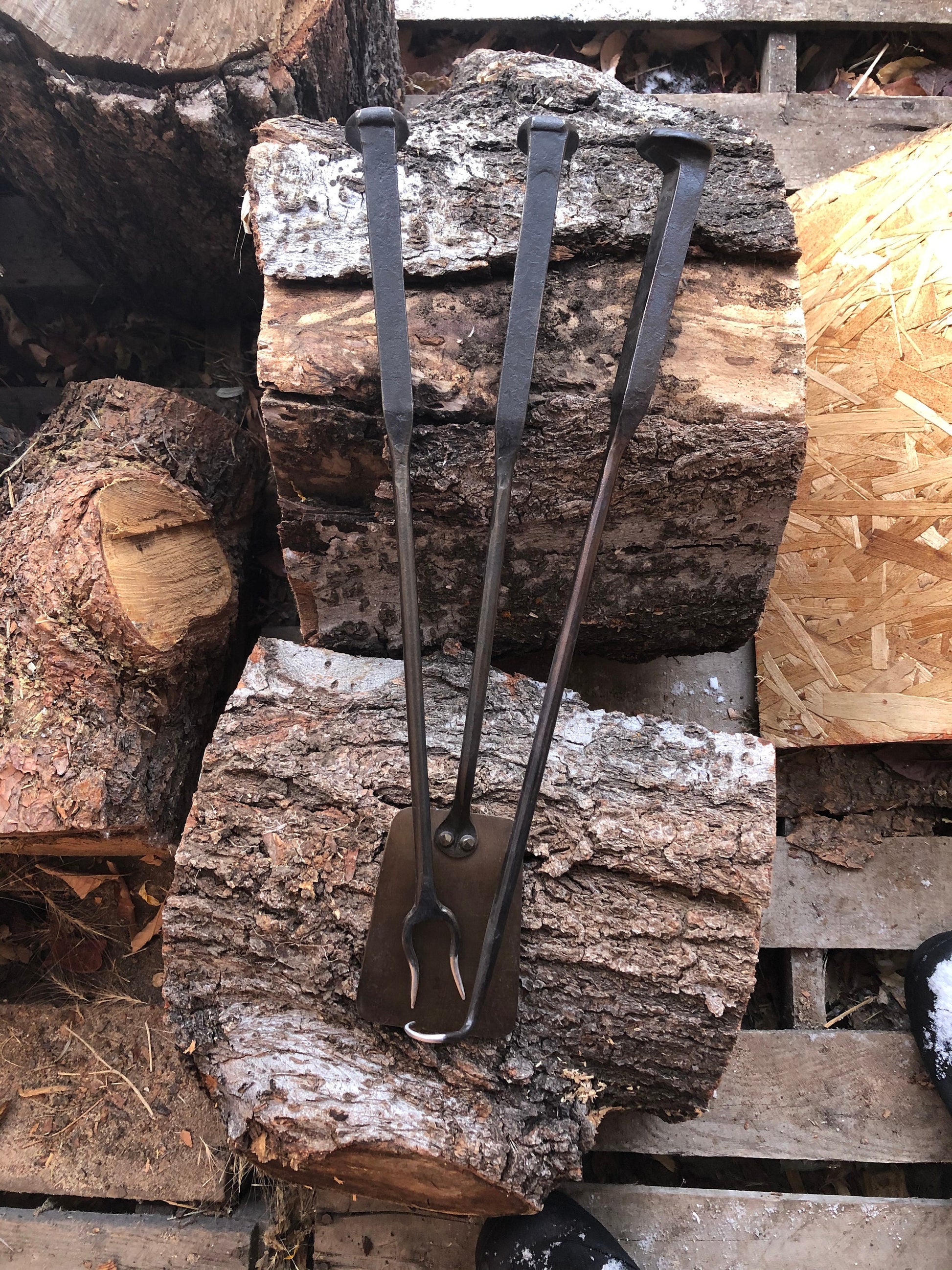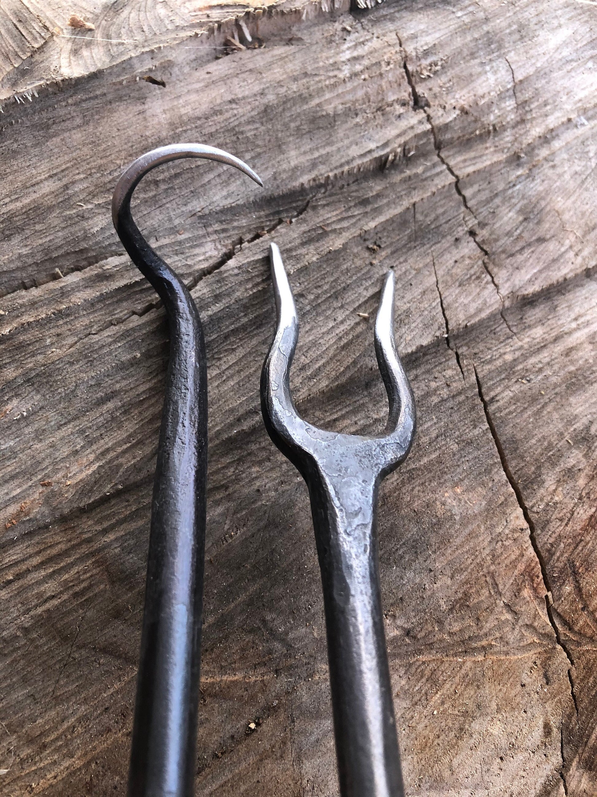 Hand forged set of grilling tools for your favorite meat or veggies! This set is all metal with railroad spikes welded on for handles.