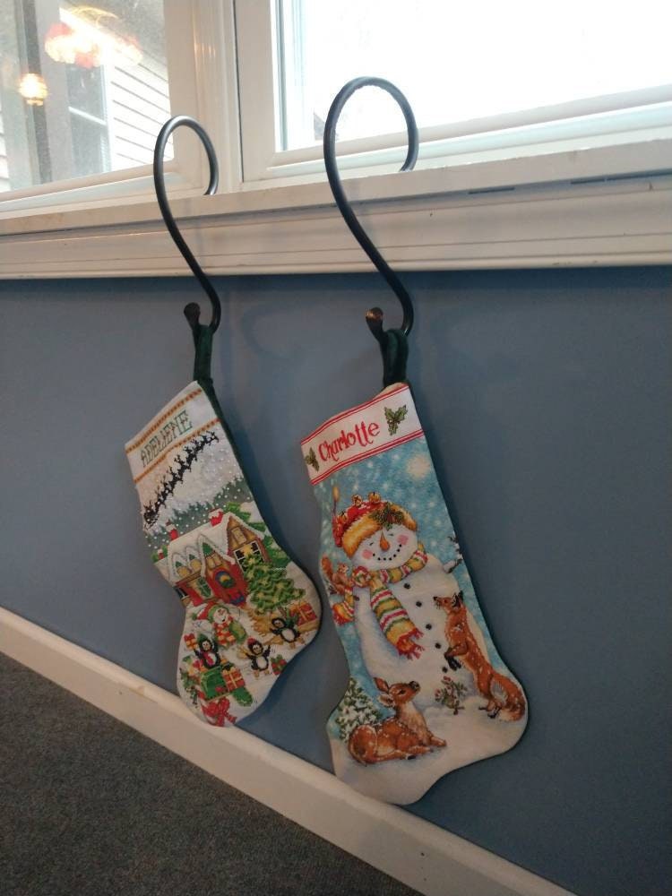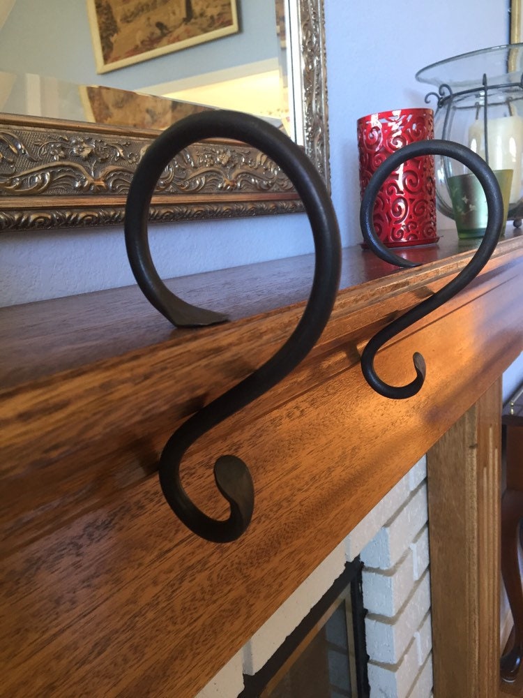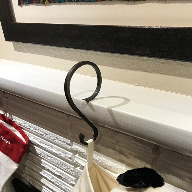 Hand forged heirloom quality iron stocking holders for displaying your Christmas stockings.  Vintage style iron mantel hanger with round edges and scrolled ends. Hand crafted in our shop in Northern California by our Blacksmith Than using modern and traditional techniques.