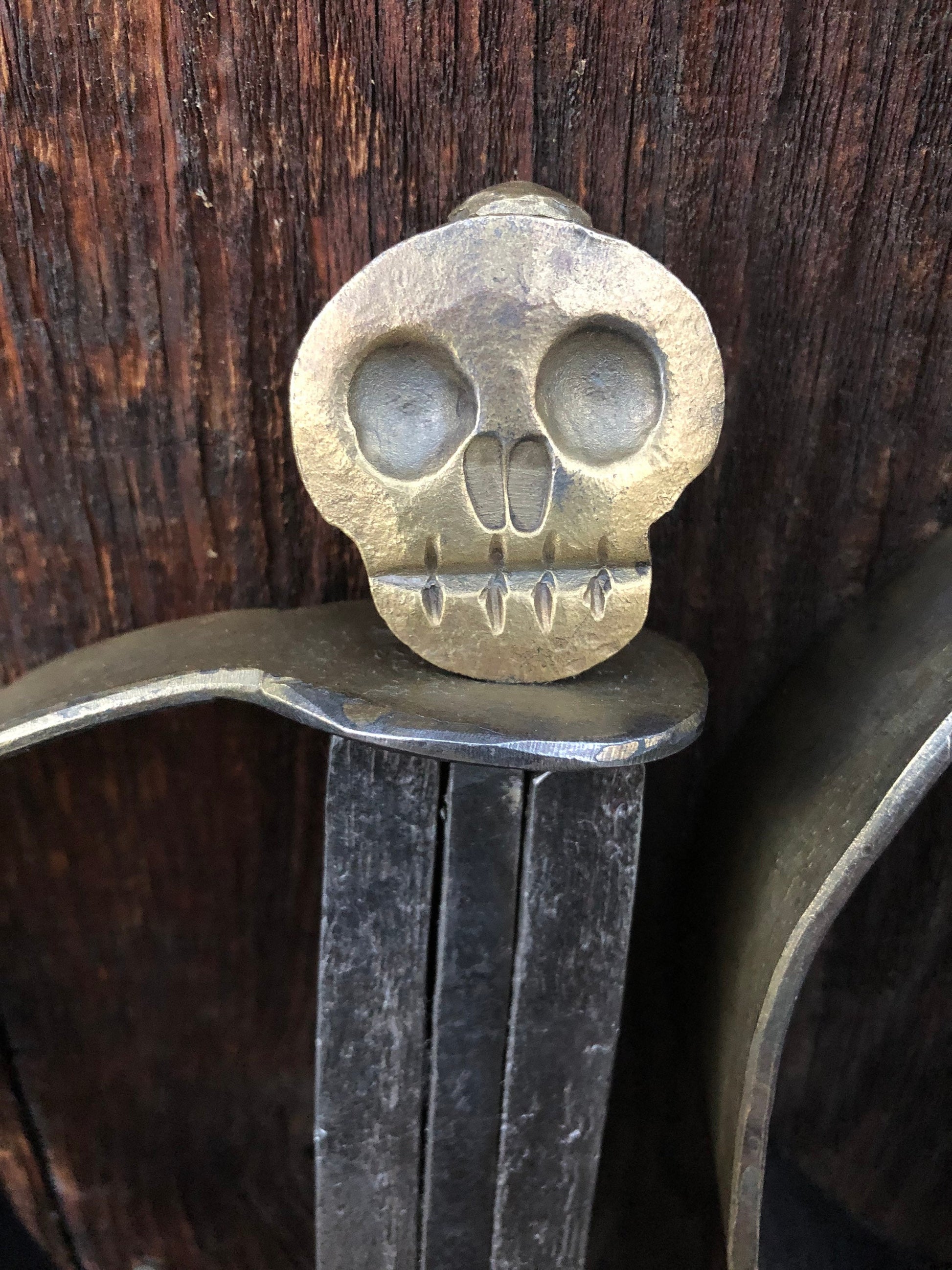 The handles are adorned with bronze brushed skulls and guards. Pieces of wrought iron, reminiscent of wood are attached to the handle with brass rivets.