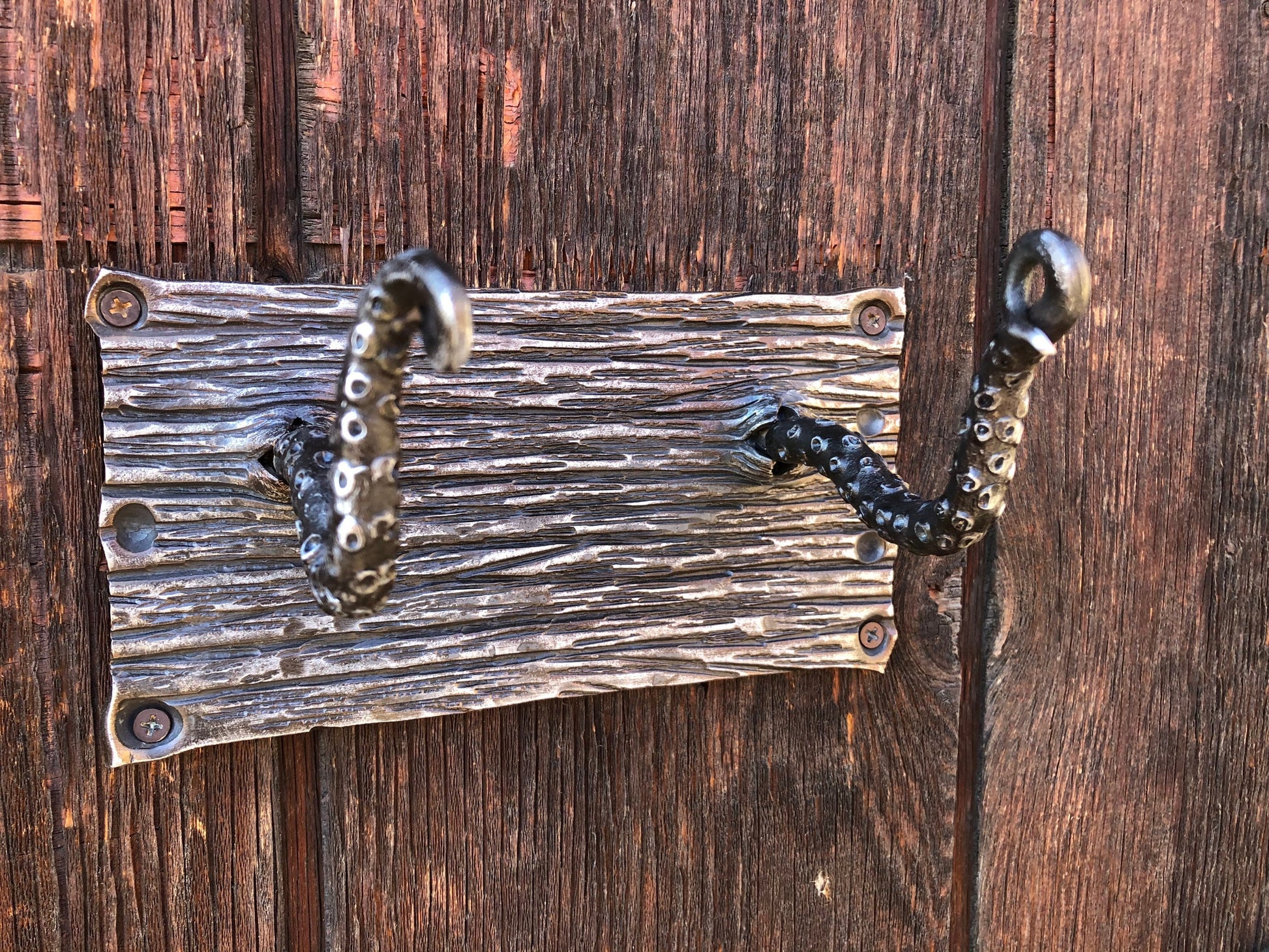 This beautifully handcrafted nautical set comes with a wall mounted rack and two fire tools. As you reach for your sword, watch out for the tentacles reaching through the deck boards. The backsplash of the rack is reminiscent of ship planks, and the hooks appear as two tentacles reaching through to the treasure below deck. The sword like fire tools hang perfectly on the rack. This set can be used as fire tools or a decorative conversation piece for when your ship mates stop by for some rum.