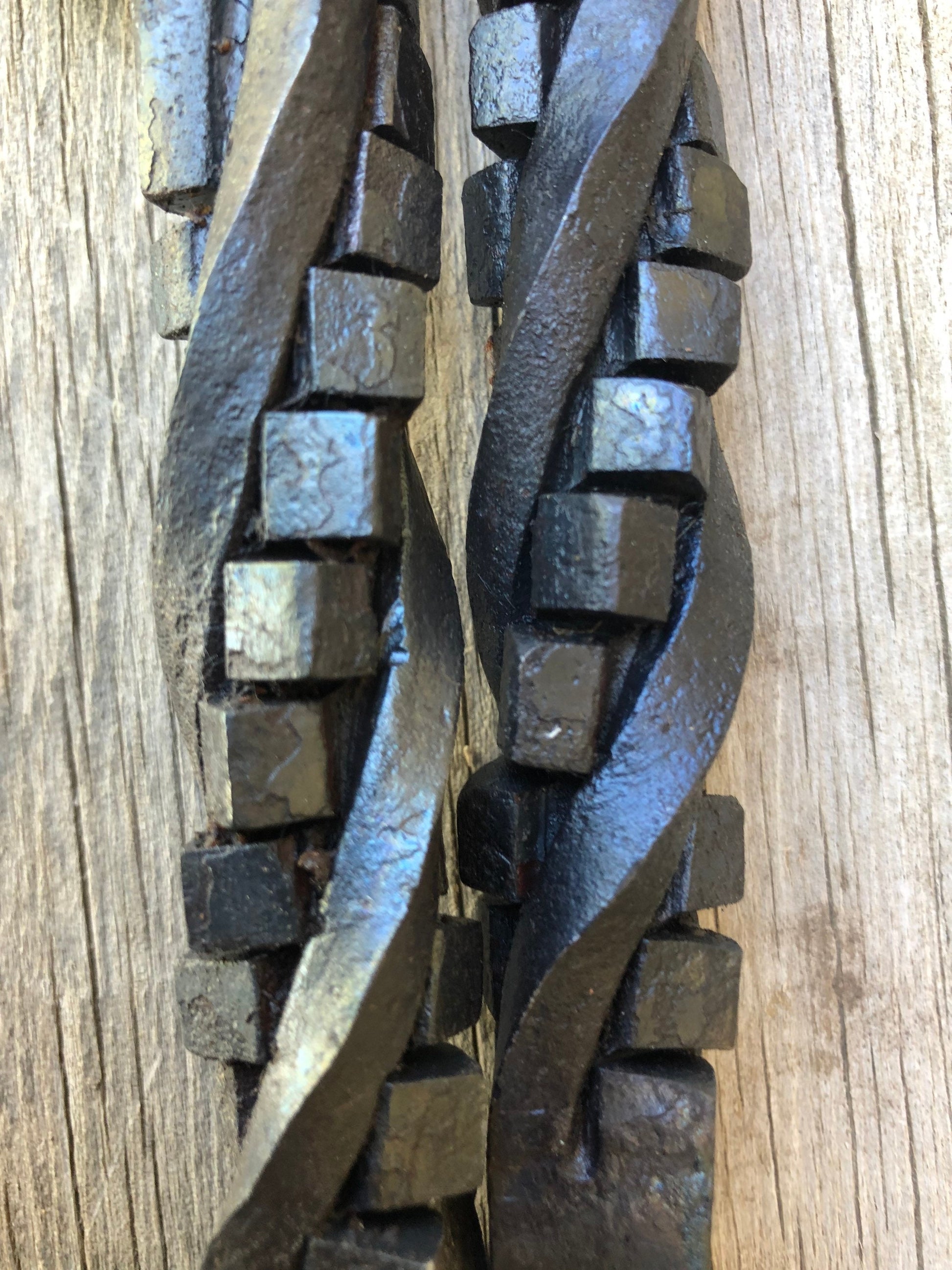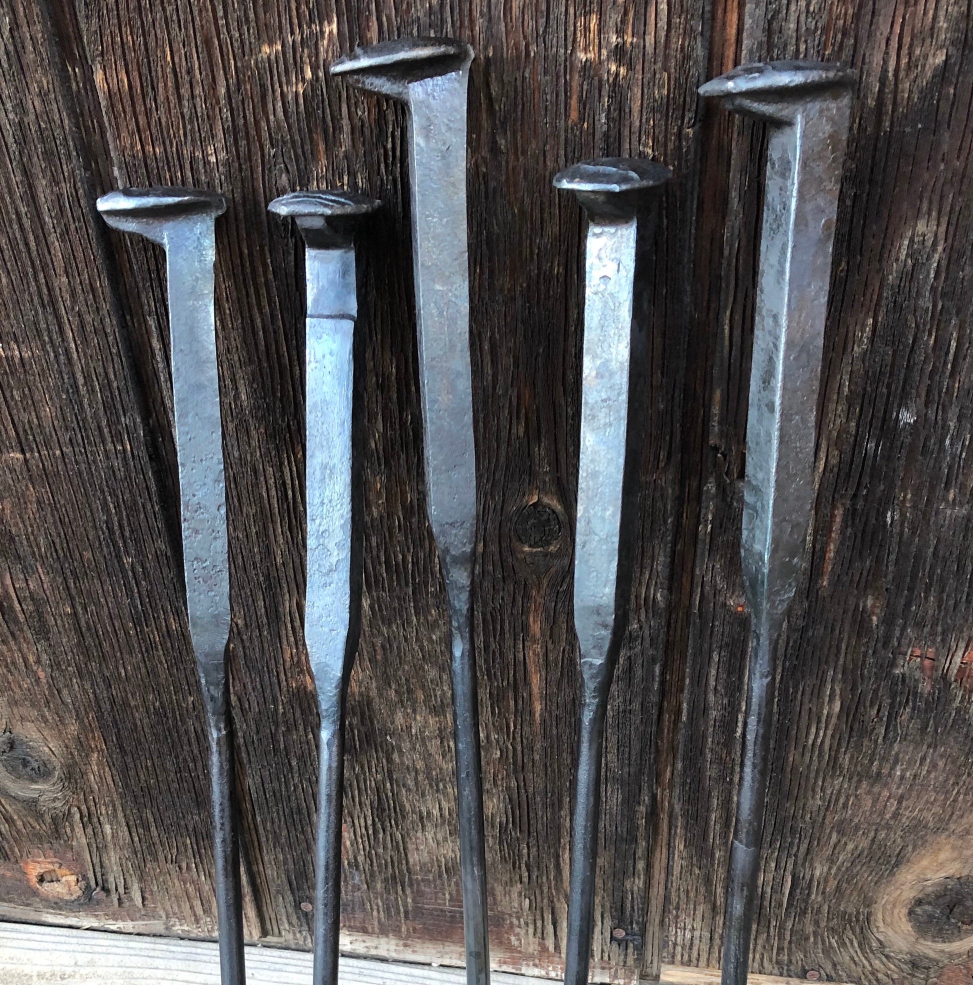 Handle Options: The handle is made of a railroad spike/nail. The handle can be shaped into three different styles: straight, twisted or stair step. The stair step is cut and twisted to form a stair step or Rubik's cube look.