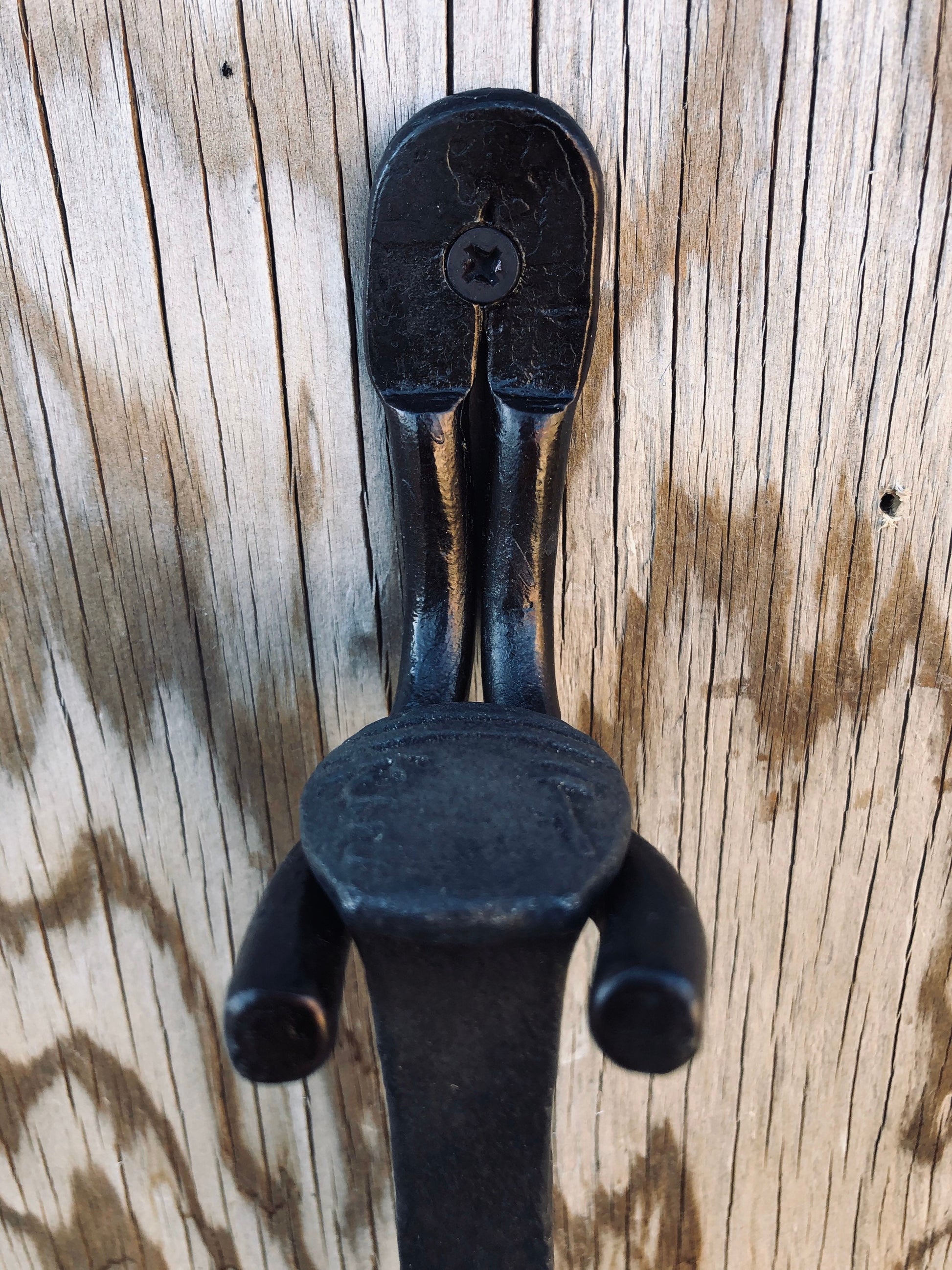 The hook is made of 3/8 inch round stock with a split design for the railroad spike handle to rest in easily. There is a single hole for wall mounting. Treated with oil for that classic wrought iron look.